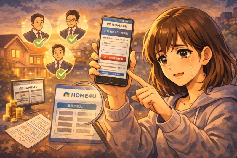 1社だけの査定では、その価格が妥当か判断できません。HOME4Uなら最大6社を比較できるため、最高値で売ってくれる会社と、現実的なリスクを教えてくれる会社の双方を見極めることができます。